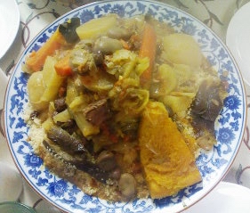 それからサラダ2種類とタジンですでに豪華な食卓にクスクスも加わった。パッと見た感じ、スペインのコシドに似てるな、と思ったけど、味はコシドよりあっさり。こっちは牛肉が入っていた。