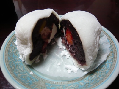 写真ではイマイチわかりにくいけど、大福にイチゴと栗とクリームチーズが入っている。当然、これだけの具が入っているのですごいサイズ。普通の大福の2倍はある。